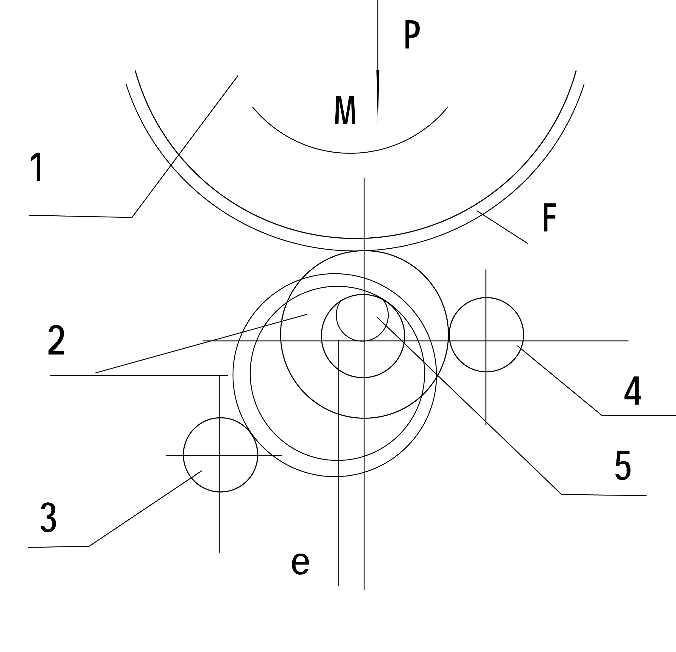 輾環機工作原理如上圖所示。溫度符合要求的環坯2套到輾壓輥5上,旋轉著的輾壓輪1在油缸力P的作用下向下運動,與環坯接觸后,環坯開始變形。此時環坯和碾壓輥在摩擦力F的作用下旋轉,環坯受到壓縮,壁厚逐漸減薄,金屬沿切線方向延伸(軸向也有少量展寬),環坯的延伸變形處于自由狀態。當環坯外徑與固定的推力輥4接觸后,推力輥的反作用力使環坯外徑增大的同時,產生彎曲變形,將環坯的幾何中心推向機器中心線的左方,并使輾擴過程平穩地進行。當環坯的外徑增大到予先調整好的信號輥3時,輾壓輪即可向上回程,鍛件卸出,完成一次工作循環。